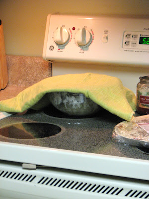 Since the oven was already preheating, this is a perfect place to let your dough rise. A towel on the bowl helps keep heat in.